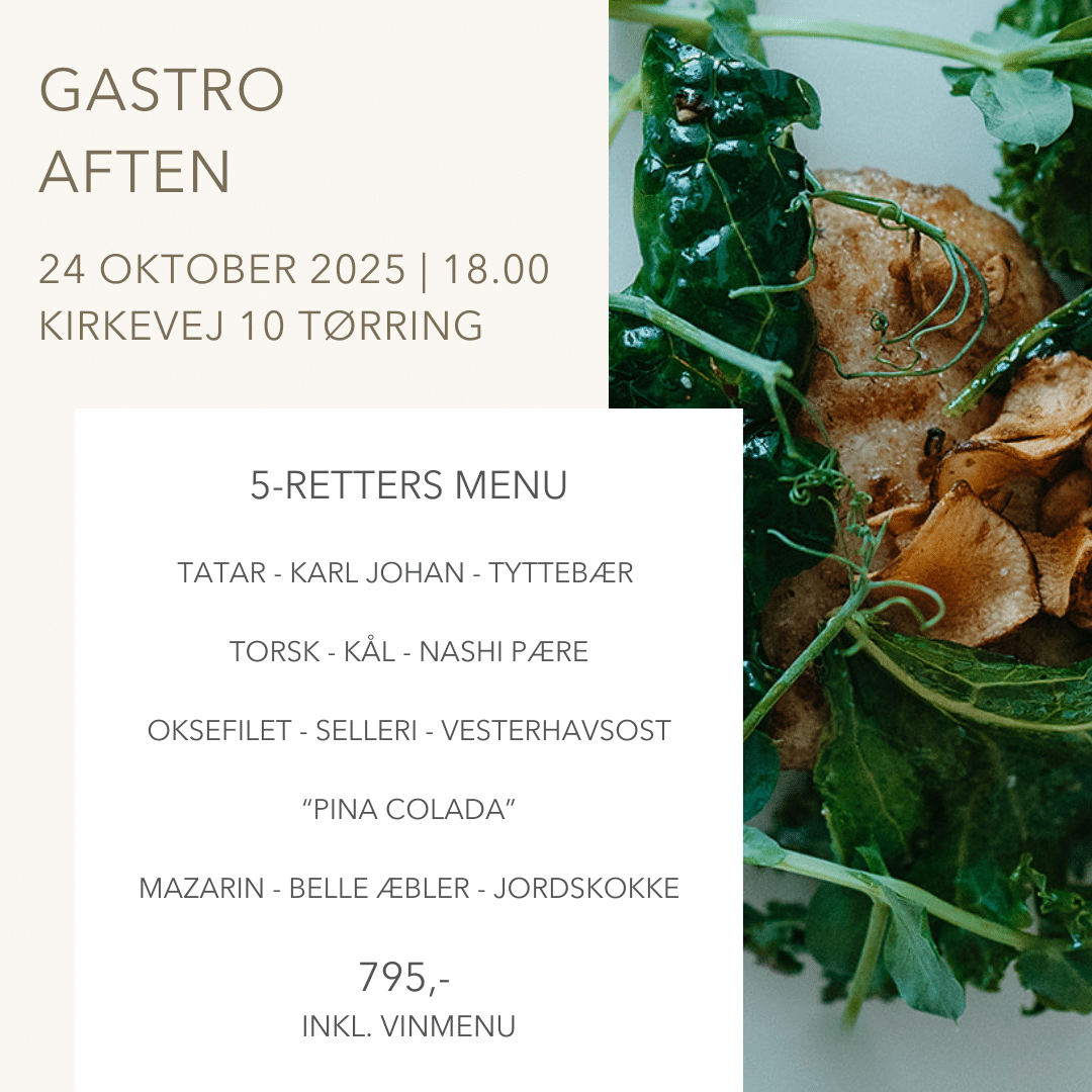 Vi inviterer til vores 5. Gastro aften og ser frem til at byde jer velkommen i vores køkken i Tørring.